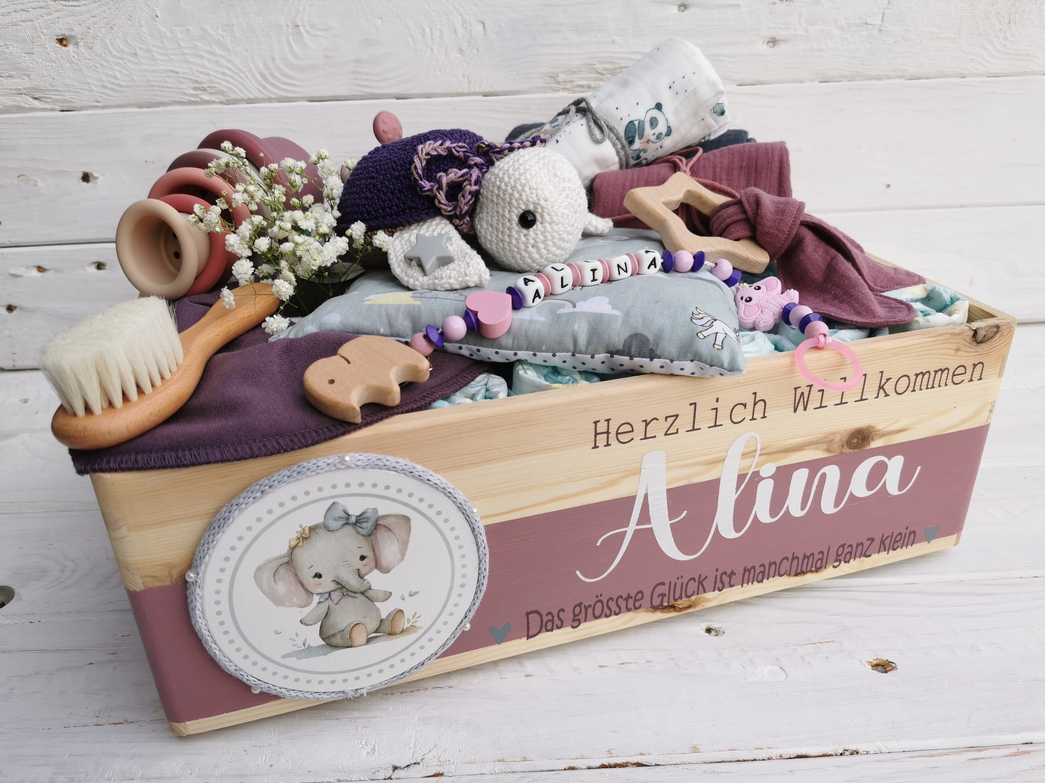 Diese Windelkiste mit handgefertigten Produkten eignet sich perfekt als Geschenk zur Geburt eines neuen Familienmitglieds.