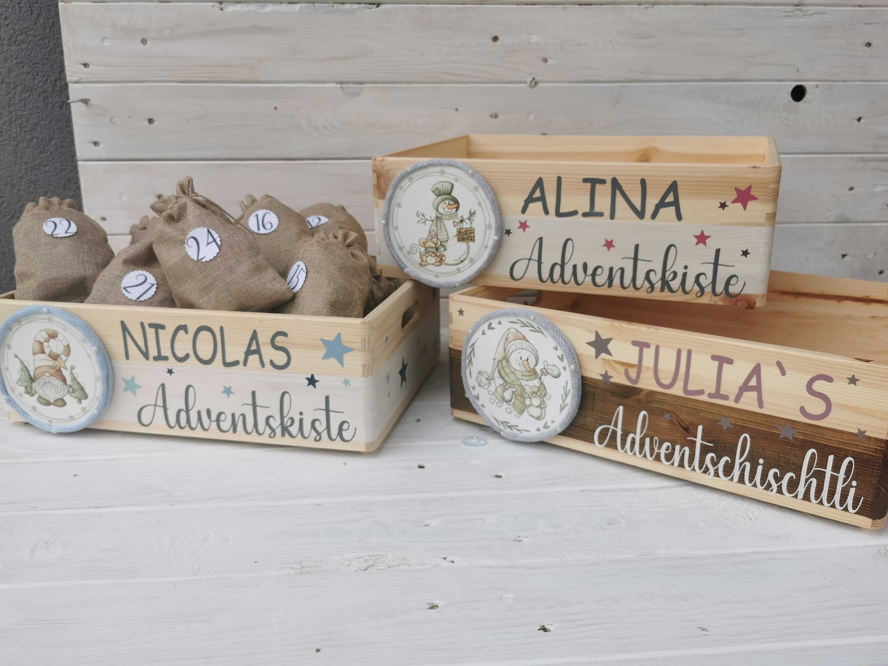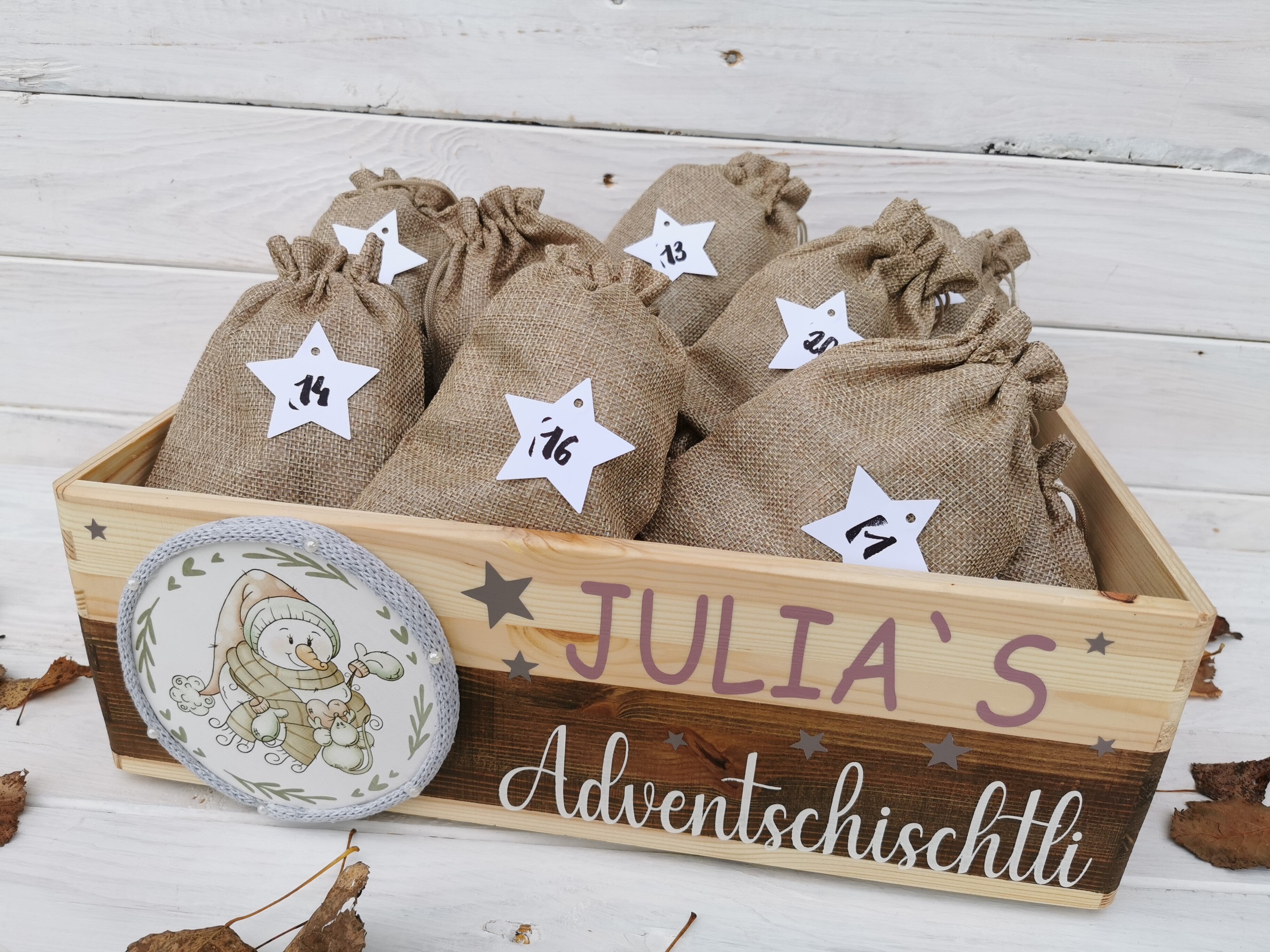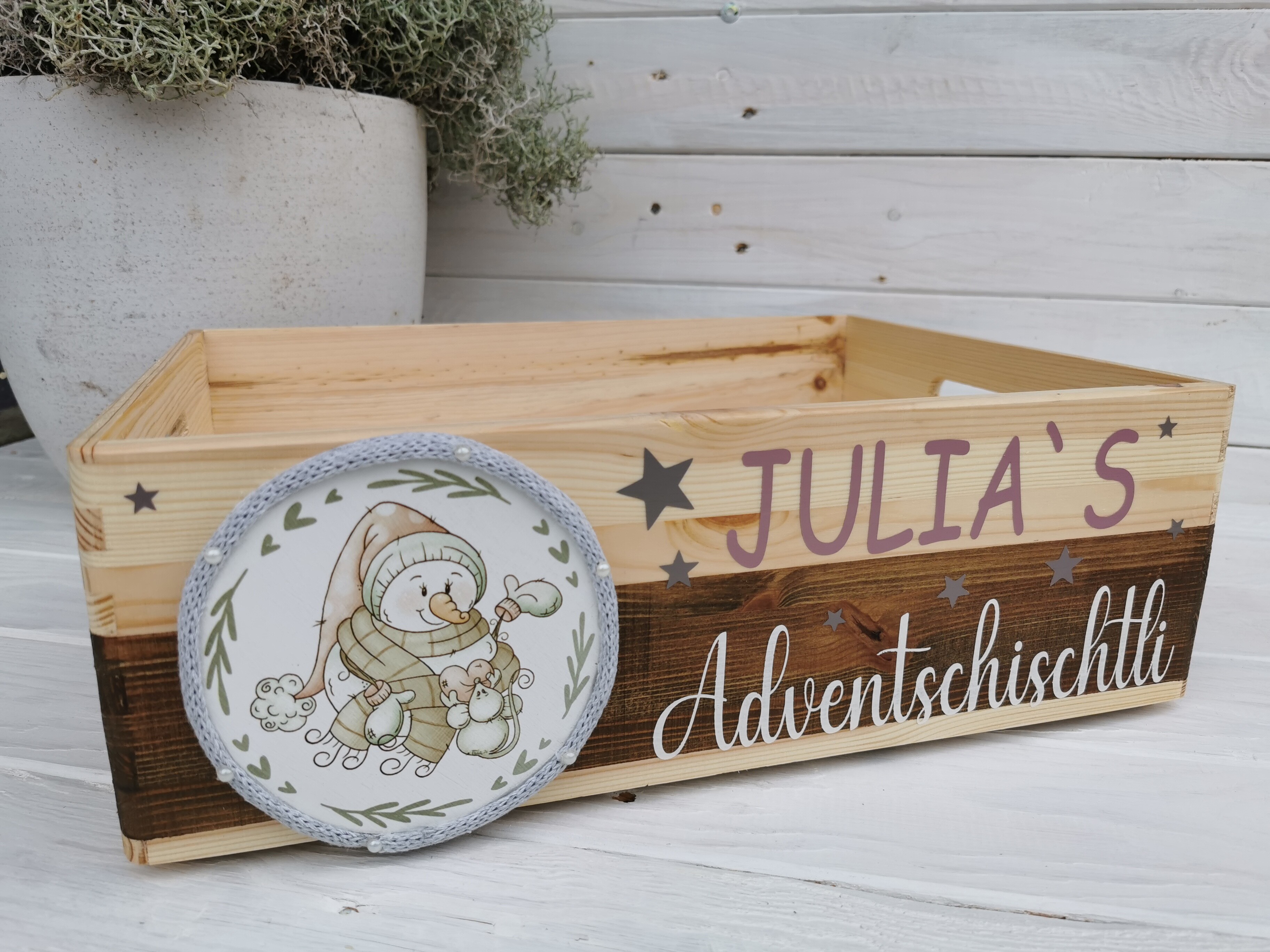 Gestalte deine ganz eigene, personalisierte Adventskiste mit deinem gewünschten Namen/Text und verschönere die Weihnachtszeit mit diesem speziellem Geschenk.